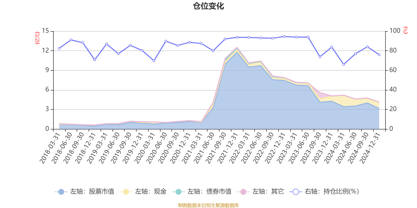 据定期报告数据统计,近三年平均股票仓位为85.23%,同类平均为79.88%。2022年末基金达到94.56%的最高仓位,2024年一季度末最低,为66.05%。