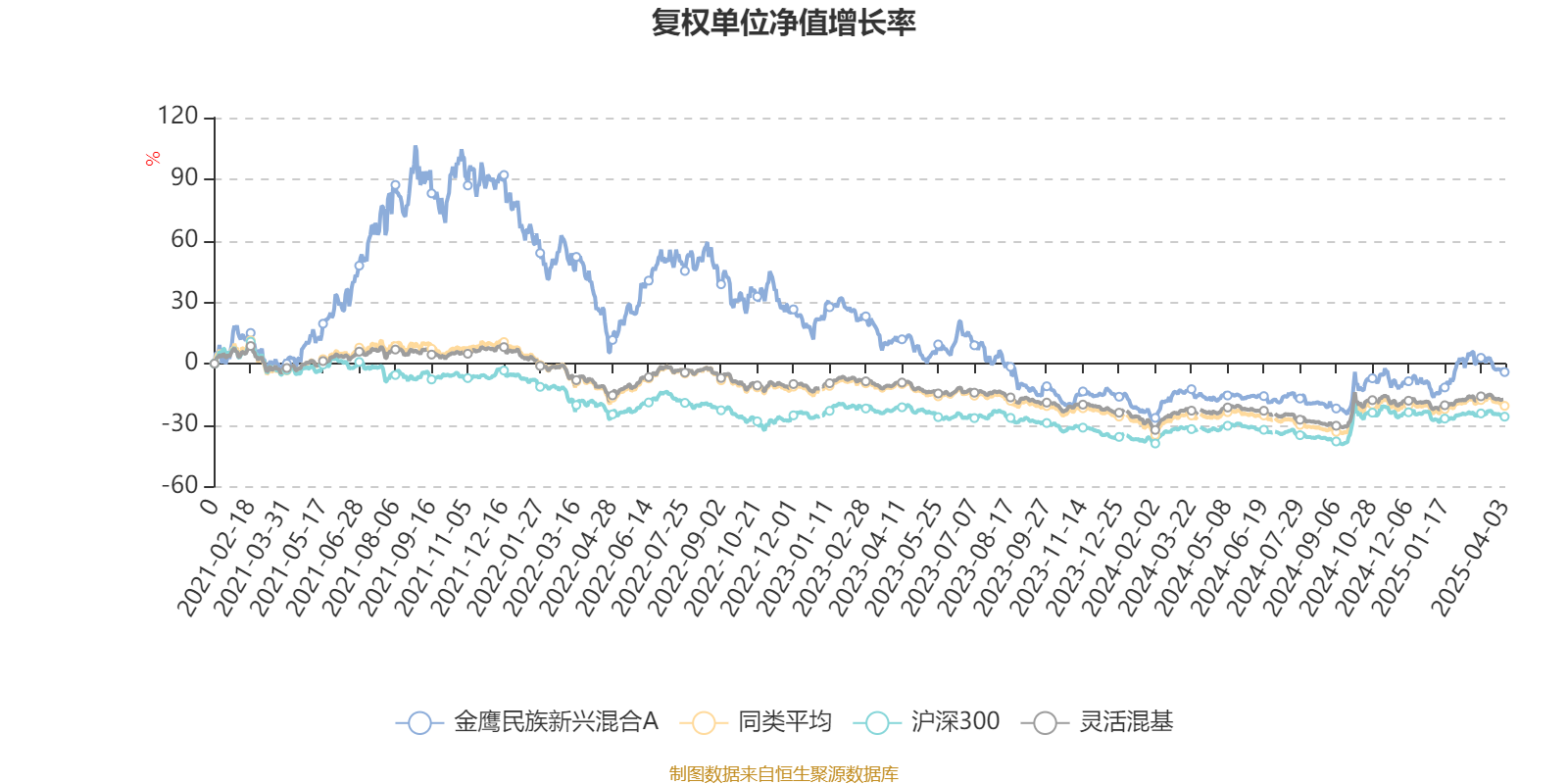 截至4月3日,金鹰民族新兴混合A近三个月复权单位净值增长率为13.48%,位于同类可比基金82/918;近半年复权单位净值增长率为7.00%,位于同类可比基金168/918;近一年复权单位净值增长率为14.01%,位于同类可比基金216/918;近三年复权单位净值增长率为-31.60%,位于同类可比基金802/901。